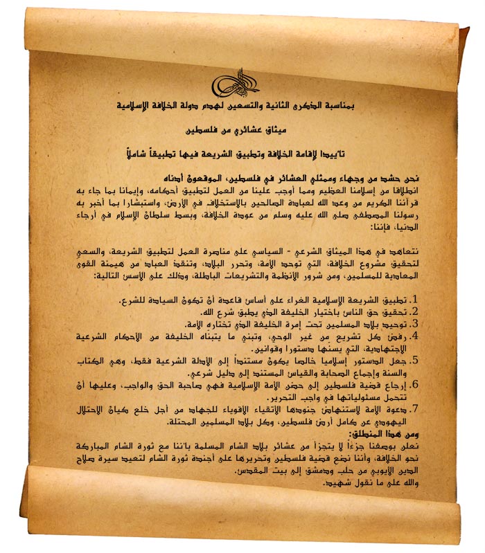 فيما يلي نص الميثاق العشائري الذي وقعه حشد من وجهاء فلسطين في الذكرى الهجرية الثانية والتسعين لهدم دولة الخلافة. ويُشار إلى أنّ الحاج عبد المعطي السيد حرباوي، أحد كبار وجهاء الخليل، كان قد سلم الميثاق لمندوب عن حزب التحرير أمام الآلاف في مؤتمر الخلافة بمدينة الخليل يوم السبت 29 رجب الفرد 1434هـ الموافق 08 حزيران/يونيو 2013م.