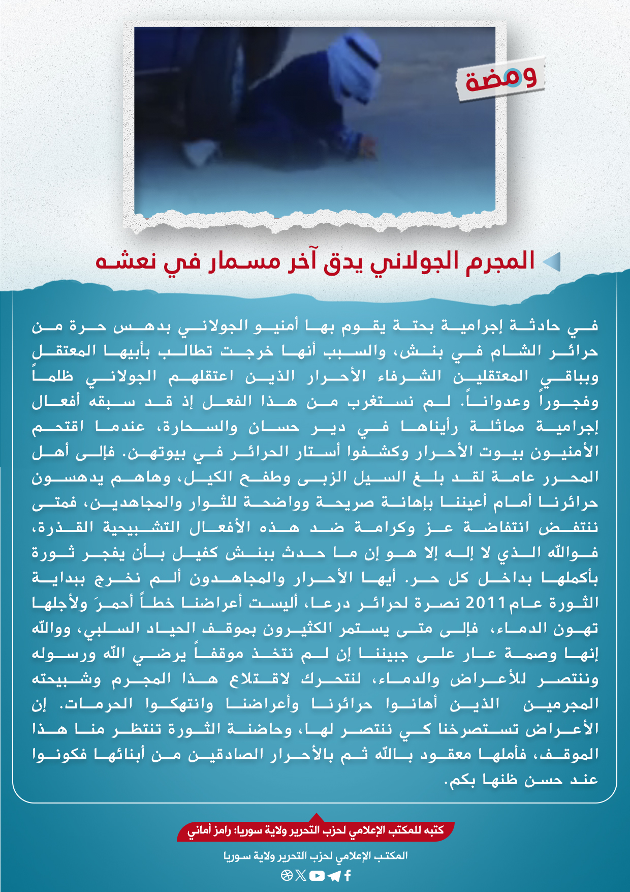 لقد آن لأهل الثورة أن يكونوا جميعاً مع الله فيسعوا لما يرضيه، وأن يكونوا مع الصادقين الساعين لتتويج التضحيات بما يكافئ هذه التضحيات، إسقاط النظام وإقامة حكم الإسلام عبر دولة الخلا.فة، وأن يعملوا جاهدين لاستعادة قرار ثو.رتهم السياسي والعسكري، وليتذكروا أن من سلم الغوطة وحلب وسراقب ومعرة النعمان لن يضن بما تبقى من مناطق "محررة".