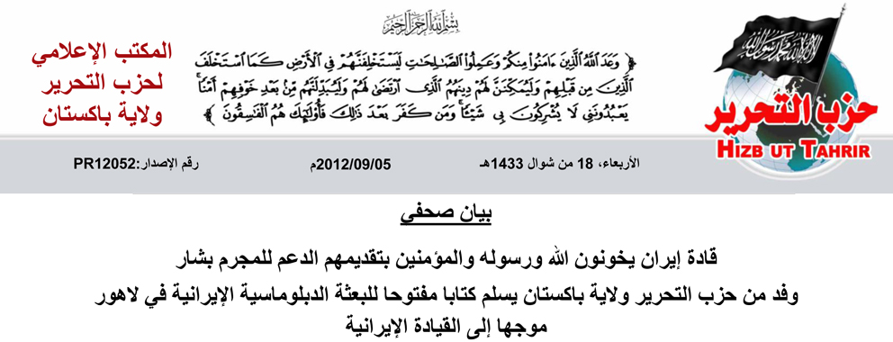 أرسل اليوم وفدٌ من حزب التحرير ولاية باكستان كتابا مفتوحا للبعثة الدبلوماسية الإيرانية في لاهور موجها إلى القيادة الإيرانية، استنكر فيه الحزب تقديم القيادة الإيرانية الدعم لبشار الأسد، قاتل الشعب السوري وعدو الله ورسوله، مدينا دعم القيادة الإيرانية لعميل أميركا، بشار، وإرسالها للجنود الإيرانيين (الحرس الثوري) إلى سوريا للقتال ضد الشعب السوري ولقتل المسلمين السوريين إلى جانب ميليشيات "الشبيحة"، وجاء في الكتاب محاسبة للقيادة الإيرانية بأن كيف لهم أن يقدموا على إرسال الجنود المسلمين من إيران لدعم بشار بينما هو وعائلته مصرون على تطبيق نظام الكفر لعقود؟! ومن ناحية أخرى فإنّ المسلمين السوريين وقفوا ضد هذا الحاكم الطاغية مطالبين بتطبيق النظام الإسلامي، والذي من شأنّه توحيد المسلمين تحت دولة واحدة للقتال ضد أمريكا؟! فهل القيادة الإيرانية لا تريد القضاء على نظام الكفر في سوريا وإقامة نظام الإسلام، الخلافة؟!