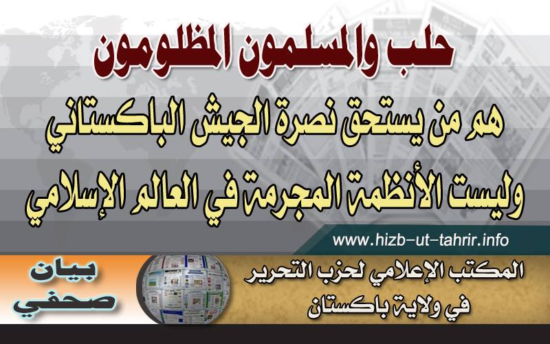 أيها القادة العسكريون في القوات المسلحة الباكستانية! لقد كشفت الفظائع التي تحصل في حلب القيادات السياسية الفاسدة في جميع أنحاء العالم الإسلامي، وإن الأمة لتغلي غضبًا من هذه القيادات لعدم نصرتها مدينة حلب، وكذلك كشمير المحتلة و ميانمار... فهي قيادات ليست جديرة بهذا الدعم من أية قوة مسلحة إسلامية، من الجنود الذين يؤمنون بالله سبحانه وتعالى ورسوله ﷺ وعندهم الاستعداد لبذل الغالي والنفيس في سبيل الله ورسوله. إن أمل الأمة معقود عليكم في المنشط والمكره، تعلمون أن حلب تحترق لأن الأصوات في سوريا تتعالى لإقامة دولة الخلافة على منهاج النبوة، لذلك فهي تستحق دعمكم من خلال تعبئتكم لقواتنا المسلحة (سابع أكبر جيش في العالم والمسلح بأسلحة نووية). يقول رسول الله ﷺ: «مَا مِنِ امْرِئٍ يَخْذُلُ امْرَأً مُسْلِماً عِنْدَ مَوْطِنٍ تُنْتَهَكُ فِيهِ حُرْمَتُهُ وَيُنْتَقَصُ فِيهِ مِنْ عِرْضِهِ إِلاَّ خَذَلَهُ اللَّهُ عَزَّ وَجَلَّ فِى مَوْطِنٍ يُحِبُّ فِيهِ نُصْرَتَهُ، وَمَا مِنِ امْرِئٍ يَنْصُرُ امْرَأً مُسْلِماً فِى مَوْطِنٍ يُنْتَقَصُ فِيهِ مِنْ عِرْضِهِ وَيُنْتَهَكُ فِيهِ مِنْ حُرْمَتِهِ إِلاَّ نَصَرَهُ اللَّهُ فِى مَوْطِنٍ يُحِبُّ فِيهِ نُصْرَتَهُ» رواه أحمد.